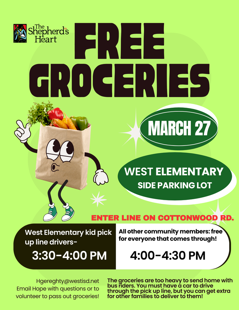 Shepherd's Heart Partnership Reminder When: Today, Friday, March 27, 2026, from 3:30-4:30 PMWhere: West Elementary School's South Parking LotWhat: Free Groceries via Waco's Shepherd's HeartWho: Any...