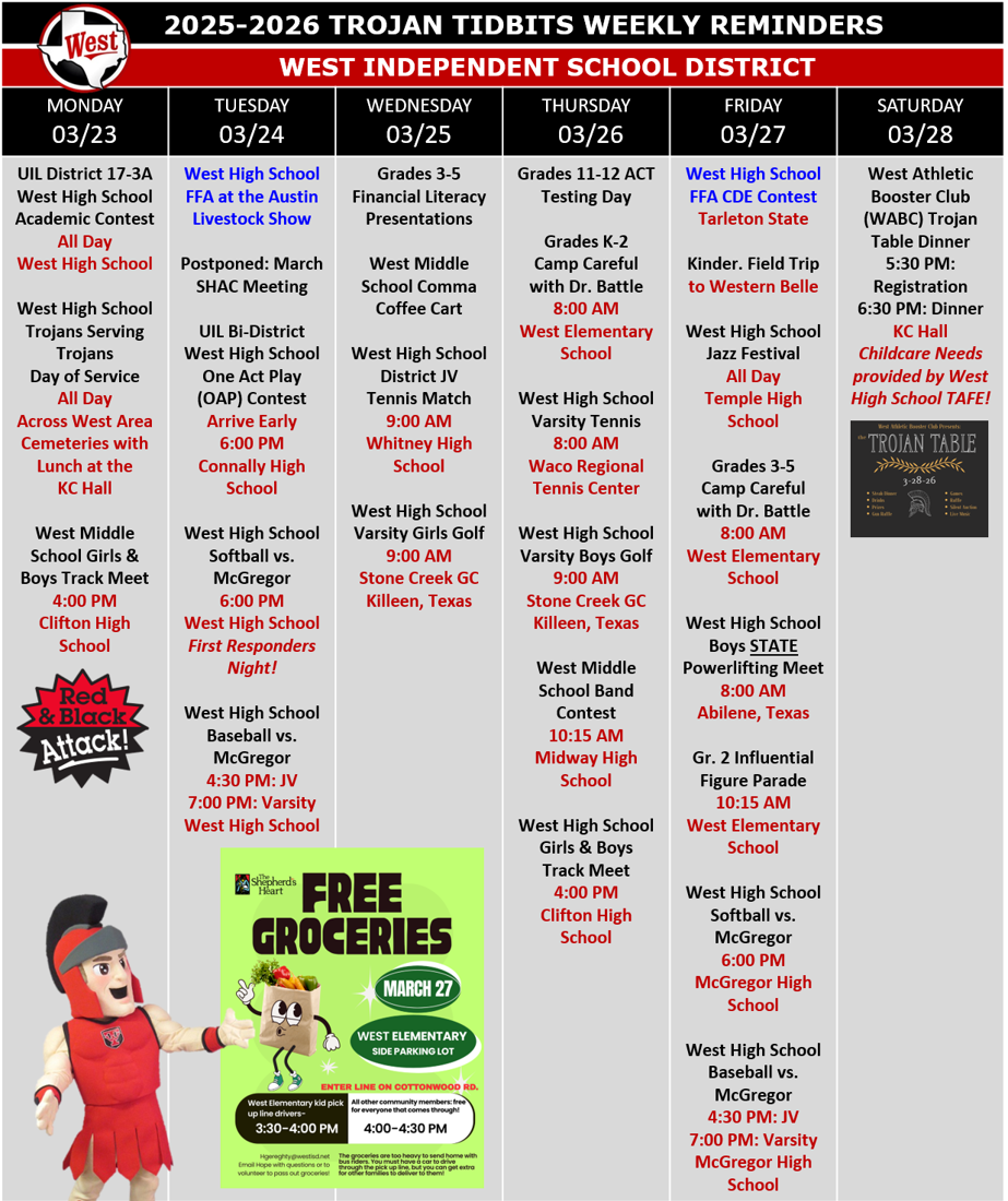• West Athletic Booster Club (WABC) Trojan Table and Childcare: There is still time to purchase tickets to the WABC Trojan Table Dinner and Raffle! Yahoo! The rescheduled event is set for this Saturday, March 28, 2026, at the KC Hall. Registration begins at 5:30 PM with the dinner and drawing beginning at 6:30 PM. To see what all your ticket covers and purchase tickets, please go to the following WABC link: https://wabc.boosterhub.com/store/10721/35790. The West High School Texas Association of Future Educators (TAFE) student group is also hosting a childcare fundraiser for all interested Trojan Table guests. The childcare will be offered from 5:30-10:30 PM at the Little KC Hall right next door to the dinner location. To review the childcare cost and sign-up information, please go to the following TAFE Google Form: https://docs.google.com/forms/d/.